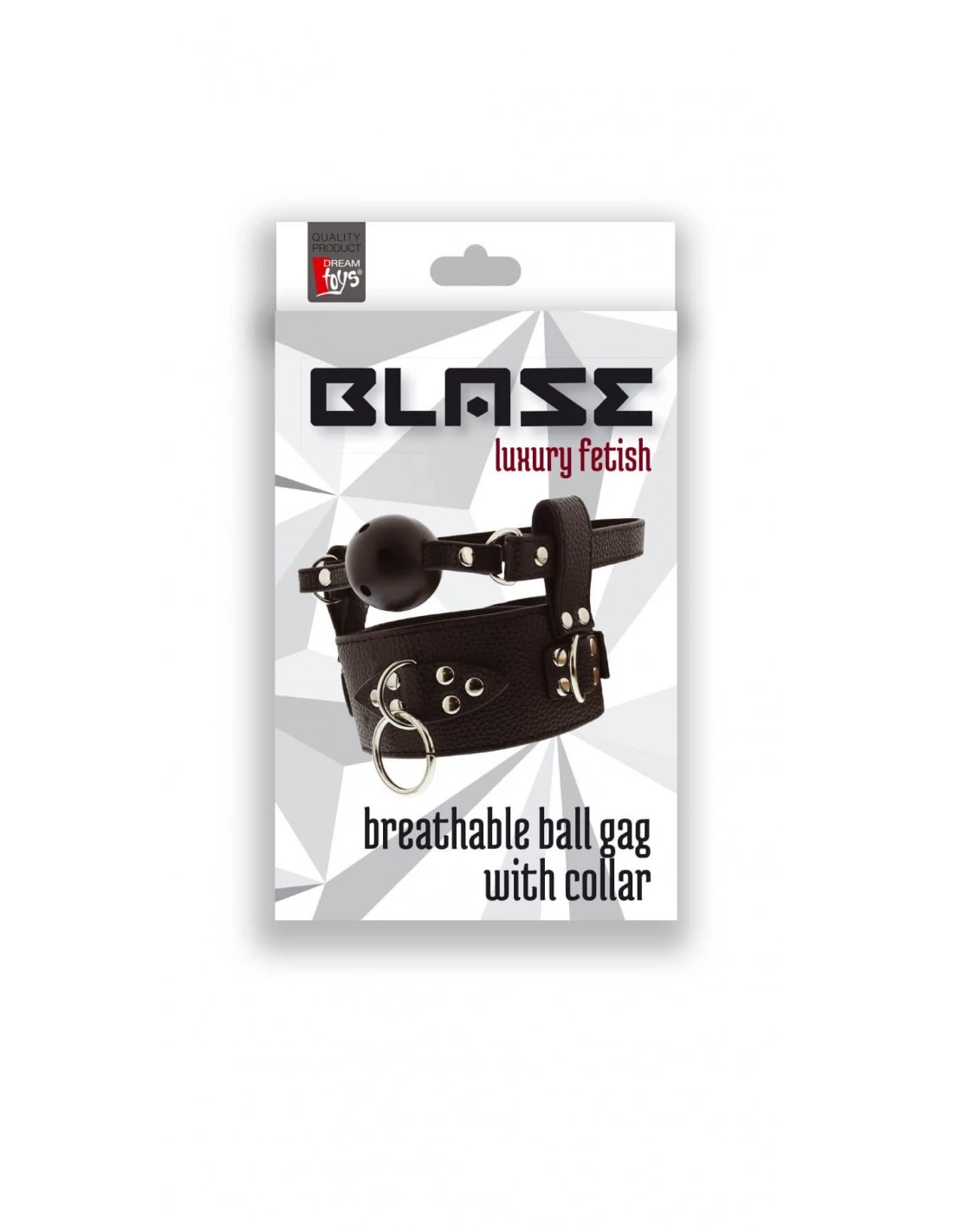 Een lederen look halsband met 2 metalen D ringen, een O ring, en een mondknevel.