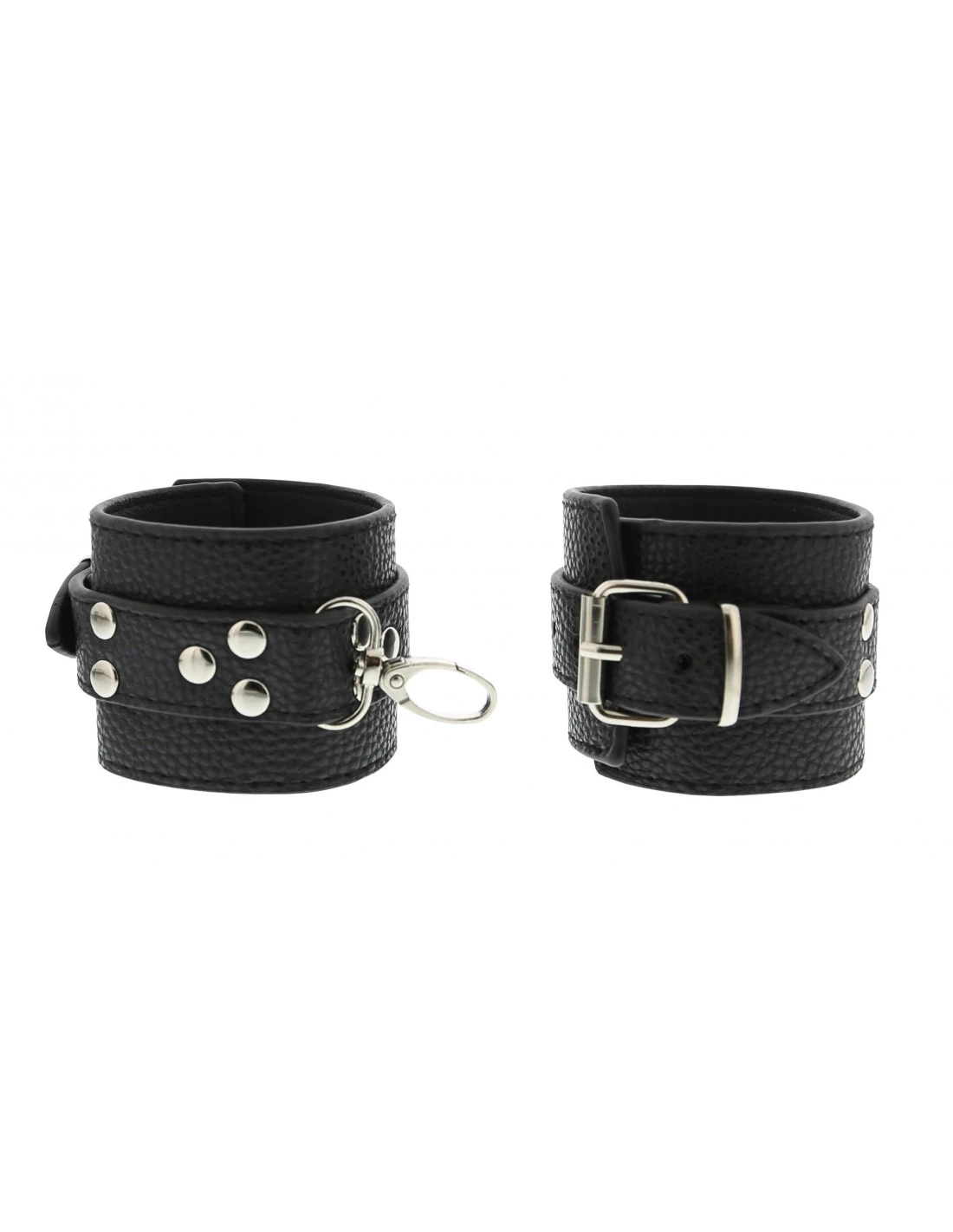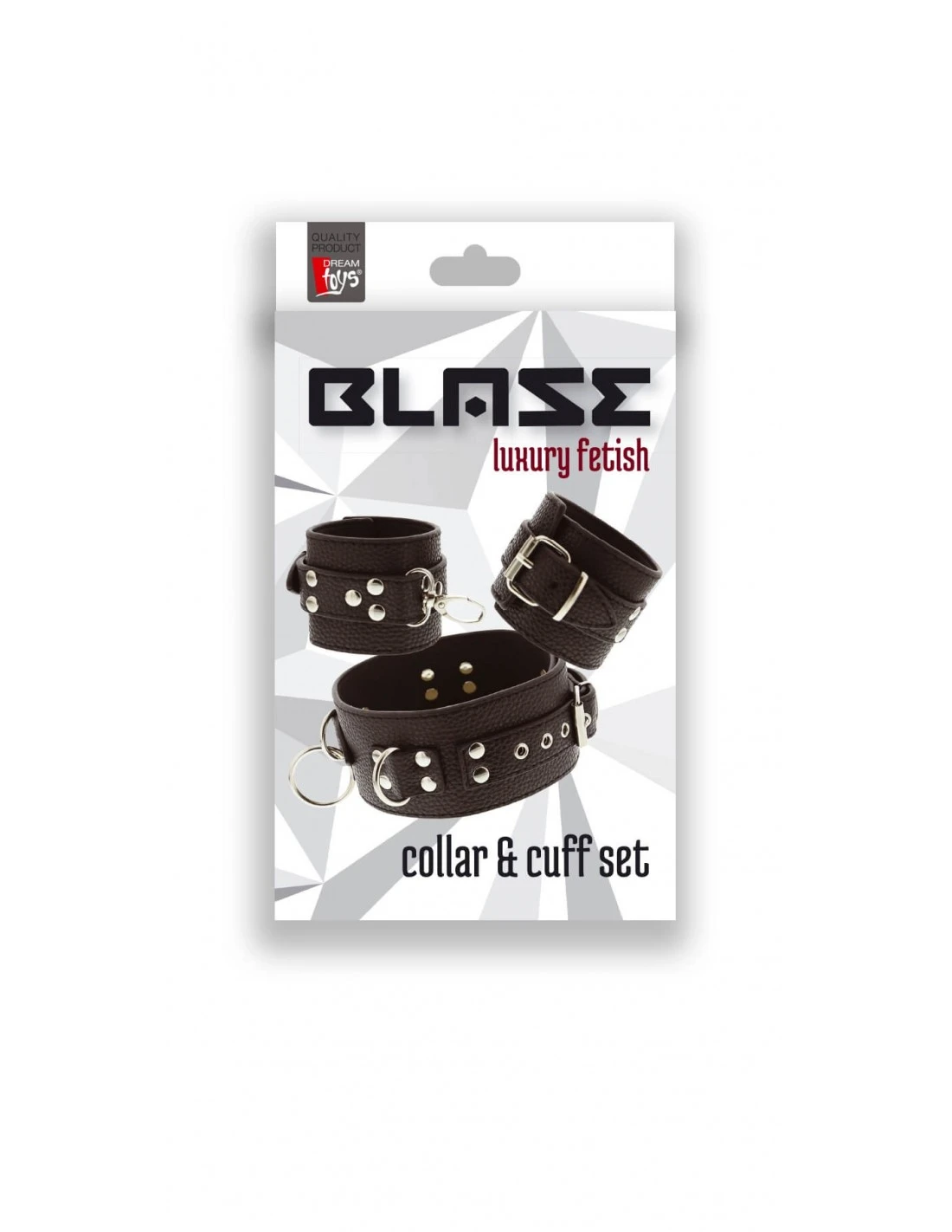 Deze set bestaat uit een halsband en 2 handboeien in lederlook met nieten.