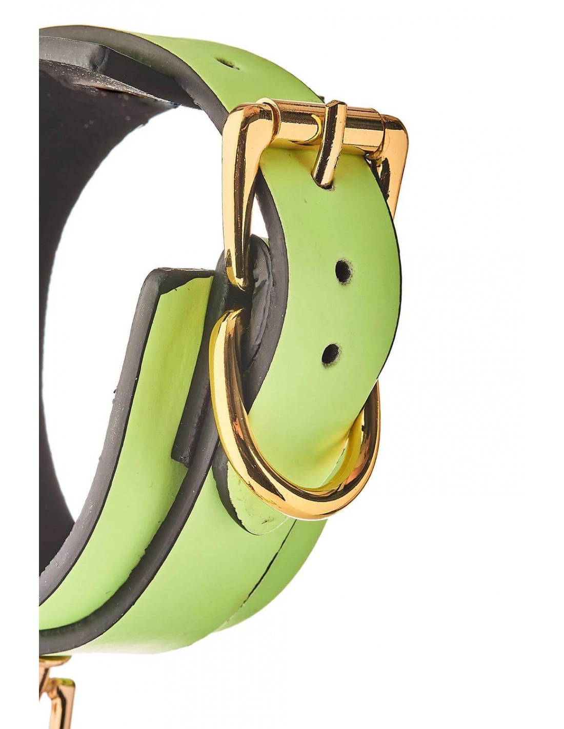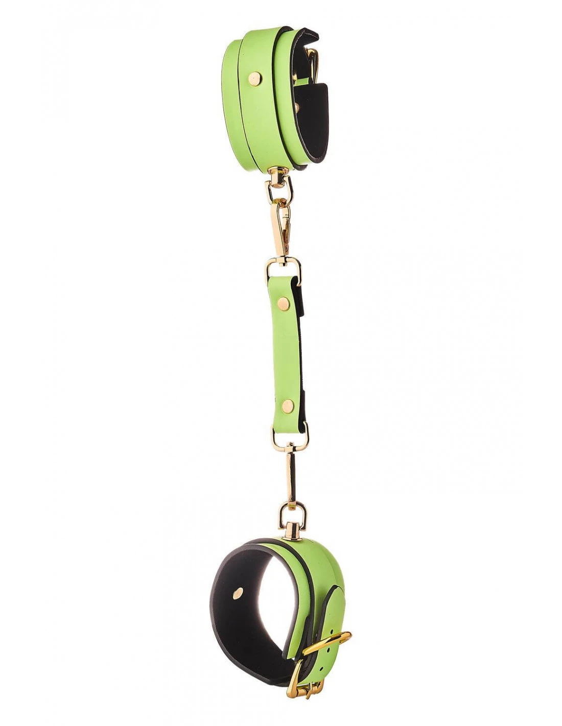 De polsboeien zijn volledig verstelbaar met de gespen. Een ketting van 10 cm lang houdt de manchetten bij elkaar.