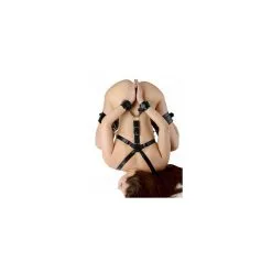 De voorste band loopt onder de borsten, en ondersteunt twee stevige metalen D-ringen waaraan de dijboeien aan gehecht zijn.