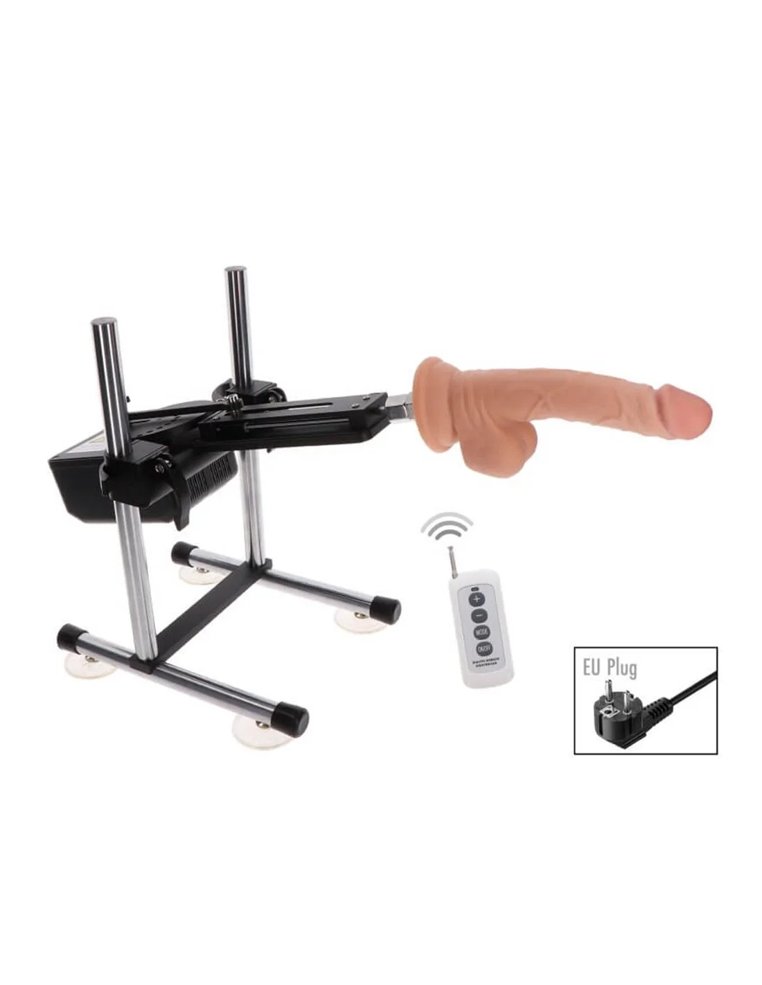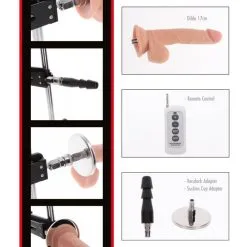 De sexmachine wordt geleverd met een afstandsbediening, een dildo van 17 cm en twee adapters.