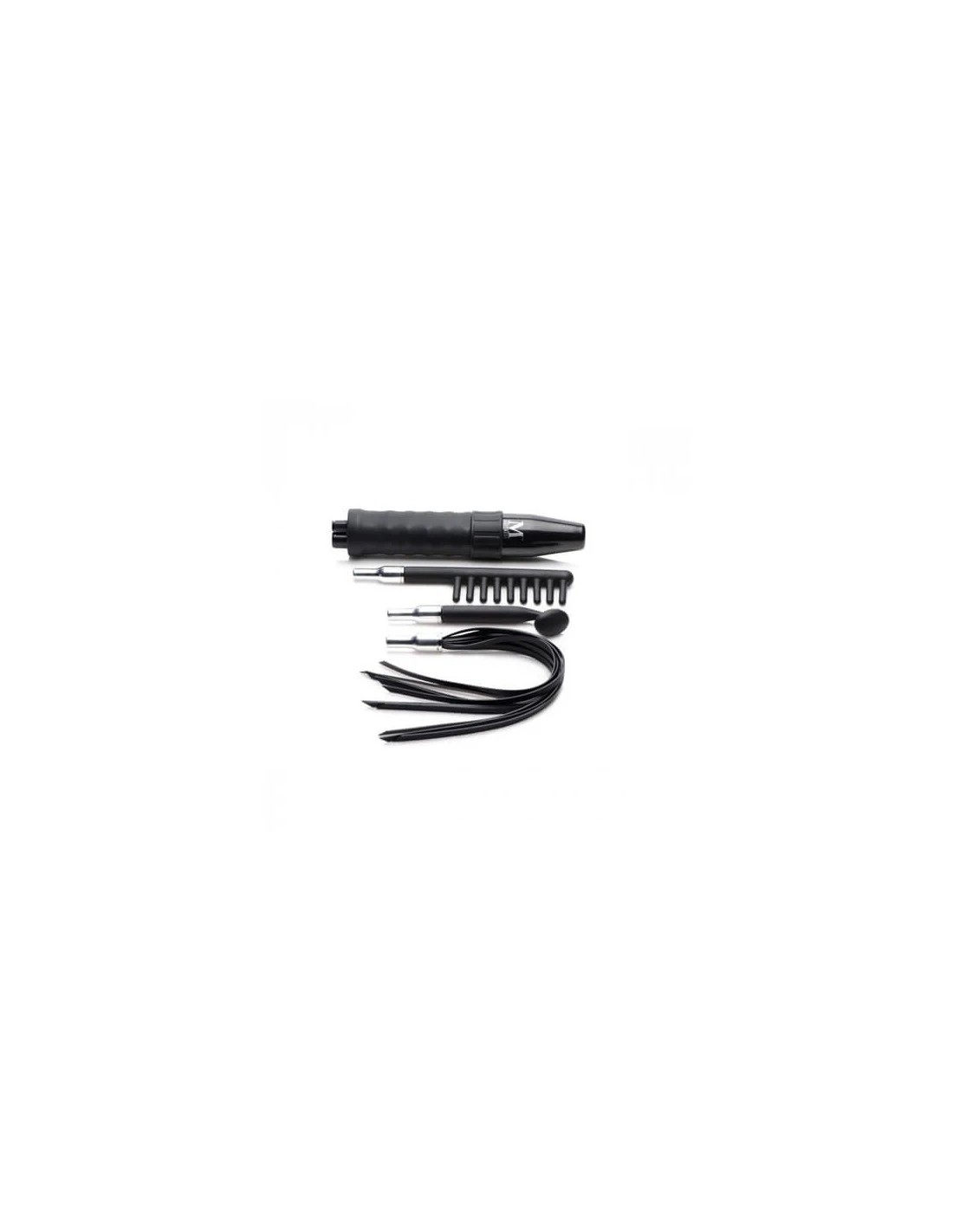 De set bestaat uit een handvat met drie verschillende opzetstukken: een flogger, een stimulator en een kam.