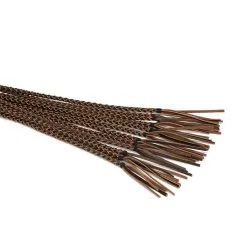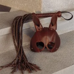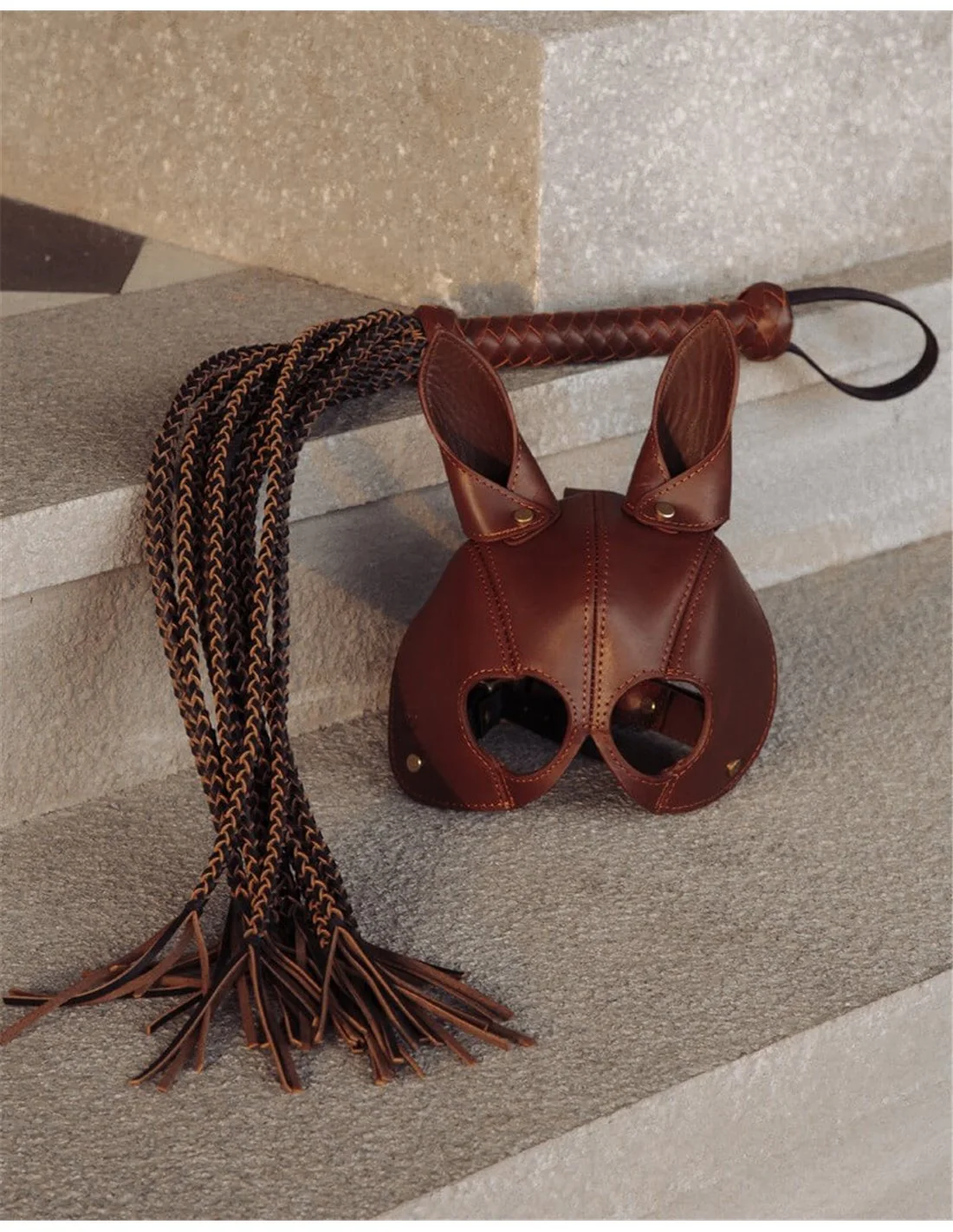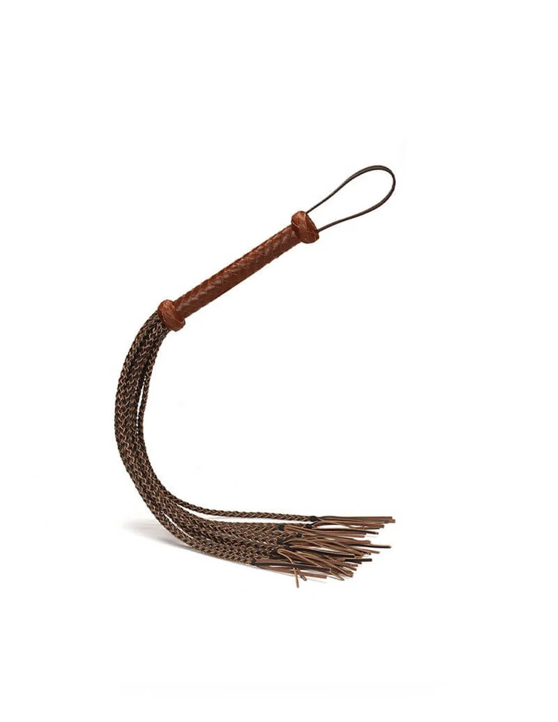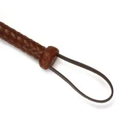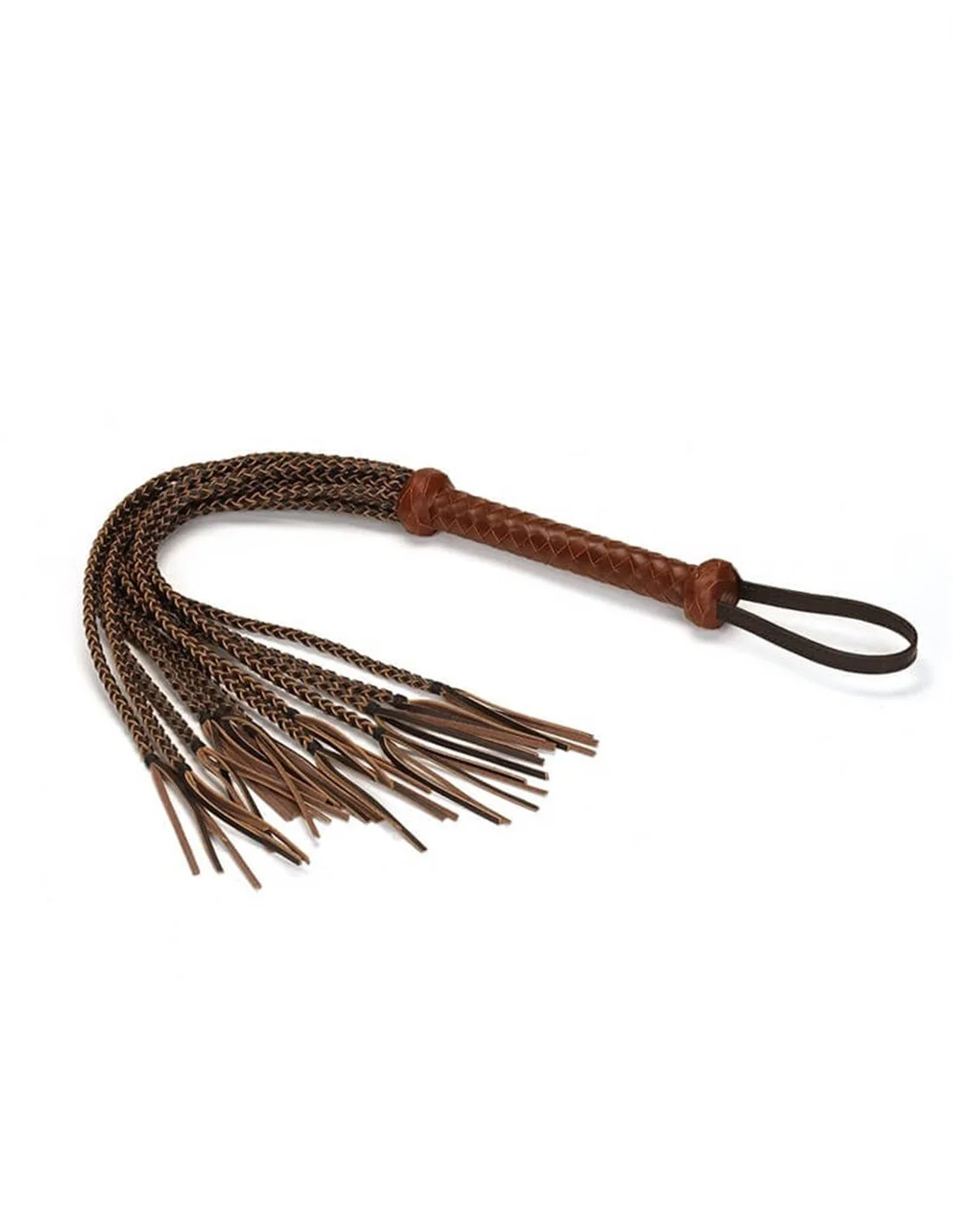 Deze flogger is gemaakt van een houten handvat, omwikkeld met echt hand gevlochten rundleer, en een set van negen strengen individueel gevlochten met een dubbel koorduiteinde per streng.