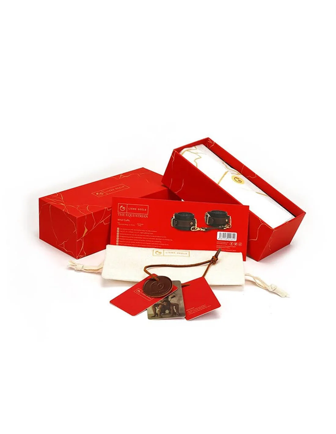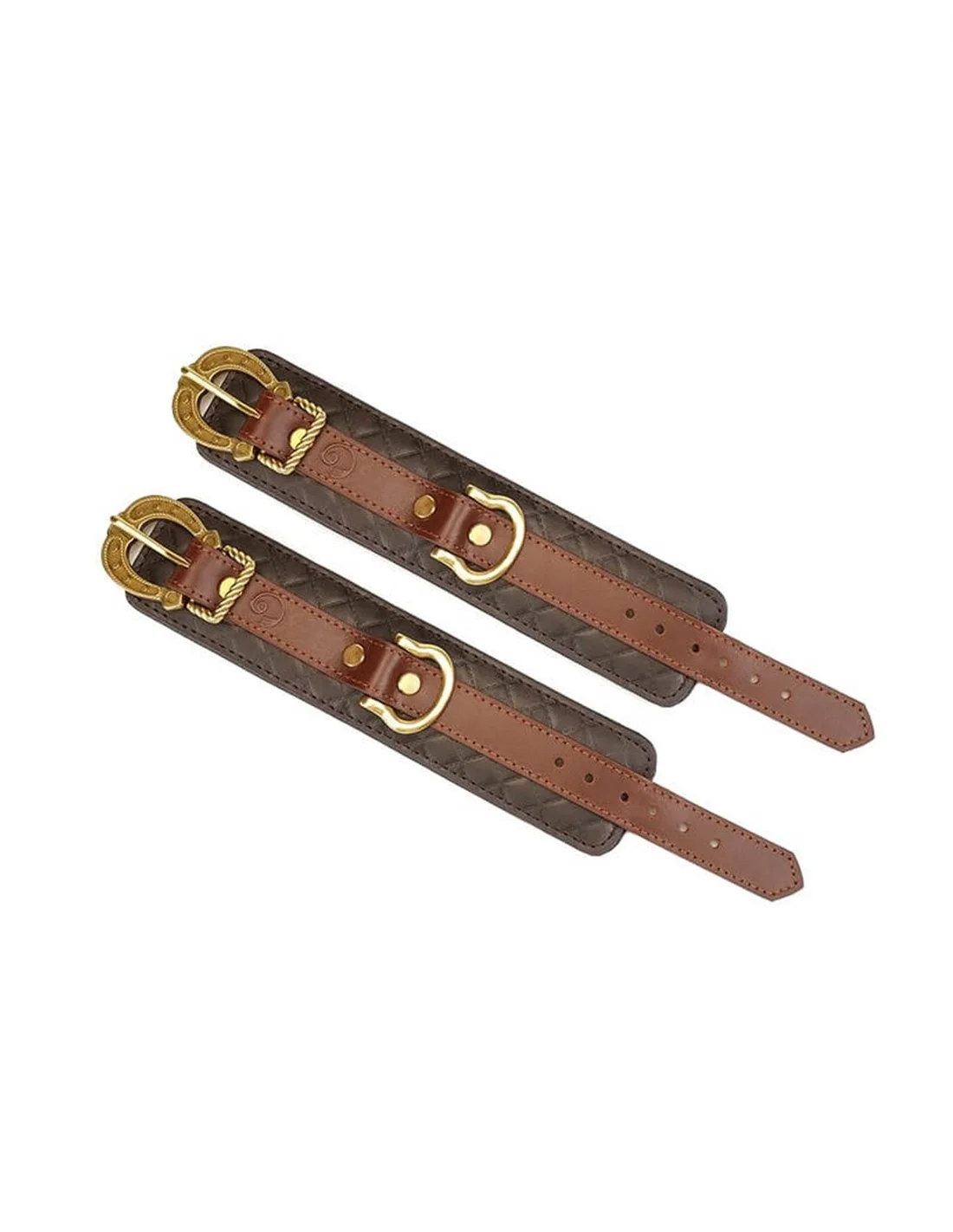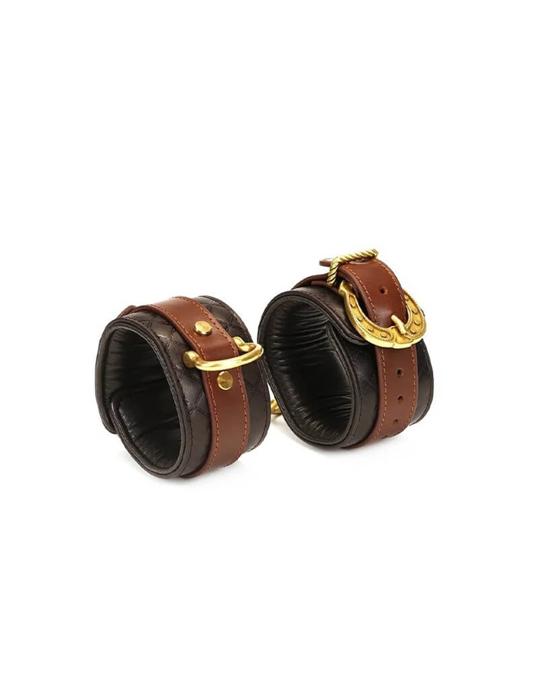 De polsboeien zijn met de hand gemaakt van echt rundleer in twee kleuren en texturen, een rijk gewatteerde binnenkant gevoerd met lamsleer om comfort te garanderen en verfraaid met The Equestrian kenmerkende accenten in het goud.