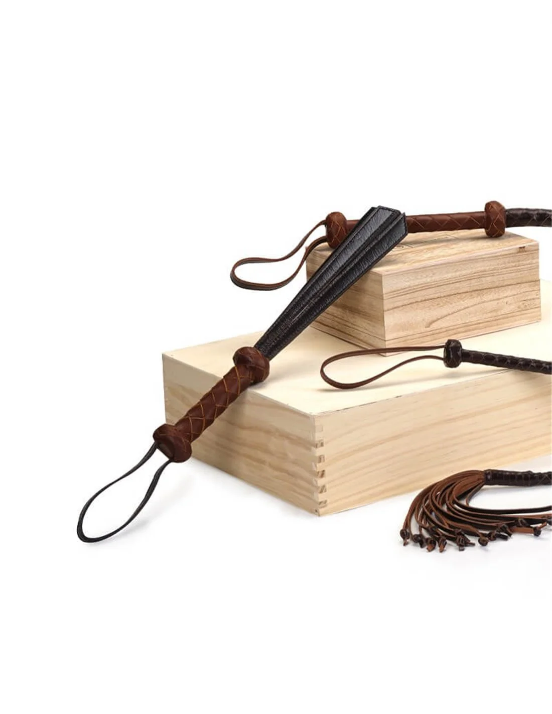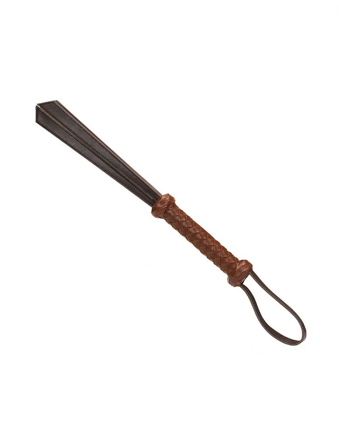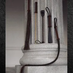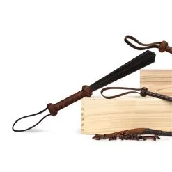 De spanking slapper is gemaakt van een houten handvat omwikkeld met hand gevlochten echt rundleer op maat en vier dubbel gelaagde leren planken.