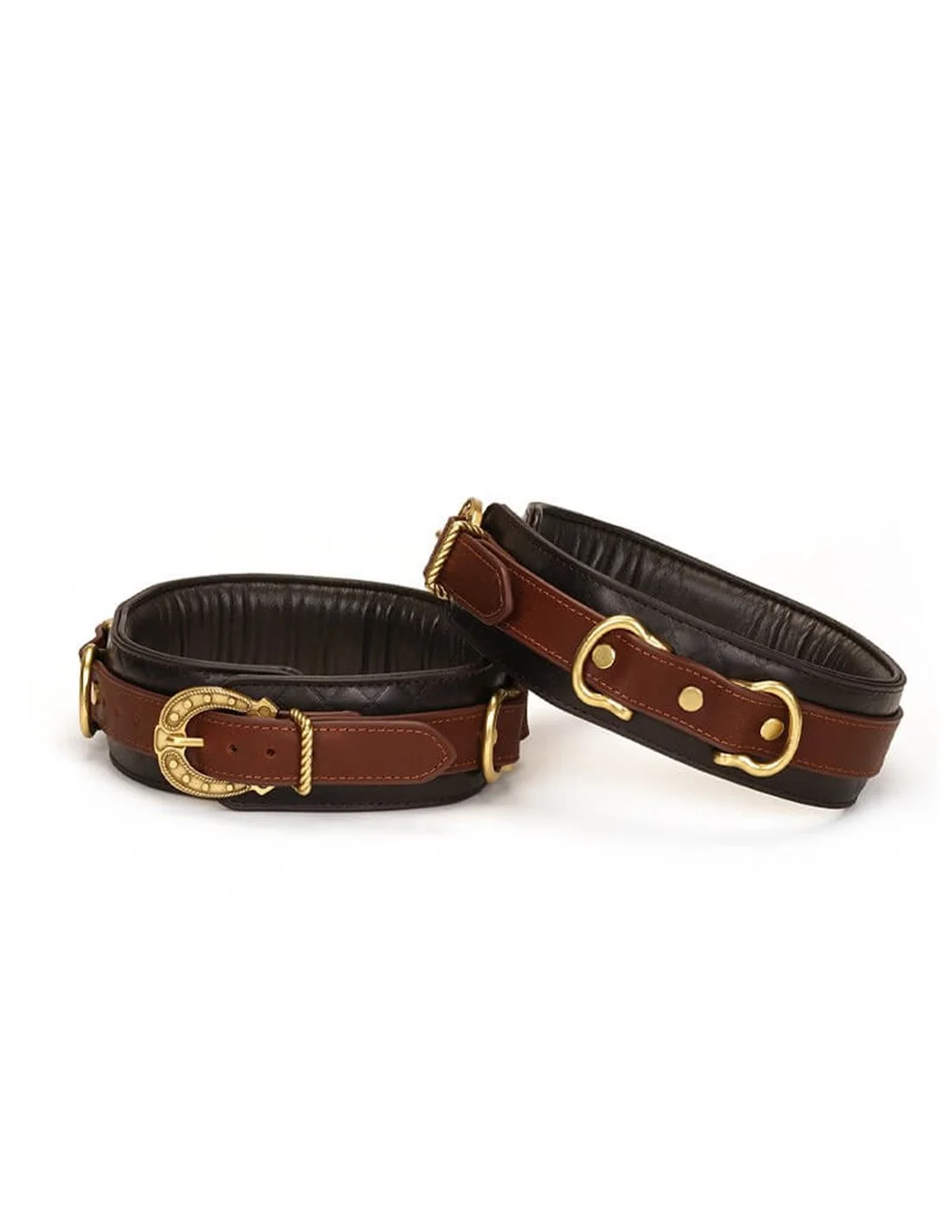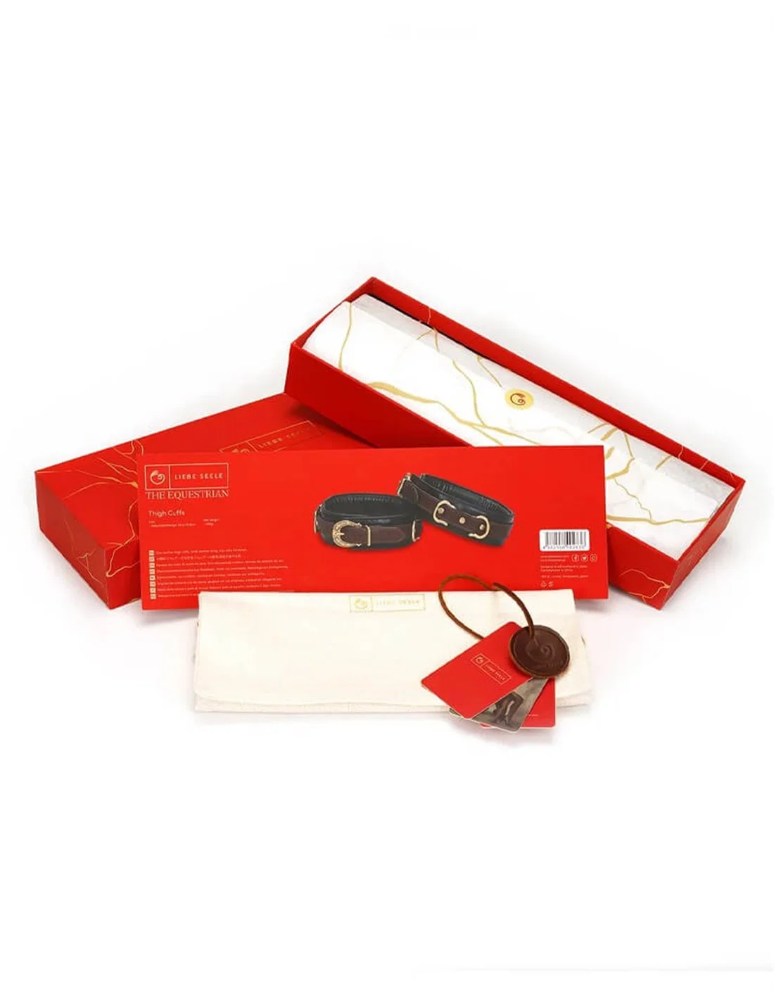 De dijbeenboeien zijn met de hand gemaakt van echt rundleer in twee kleuren en texturen, een rijk gewatteerde binnenkant gevoerd met lamsleer om comfort te garanderen en verfraaid met The Equestrian kenmerkende accenten in het goud.