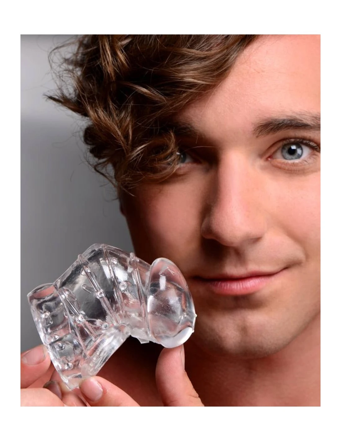 De binnenkant is voorzien van noppen die de eikel stimuleren tijdens het dragen.