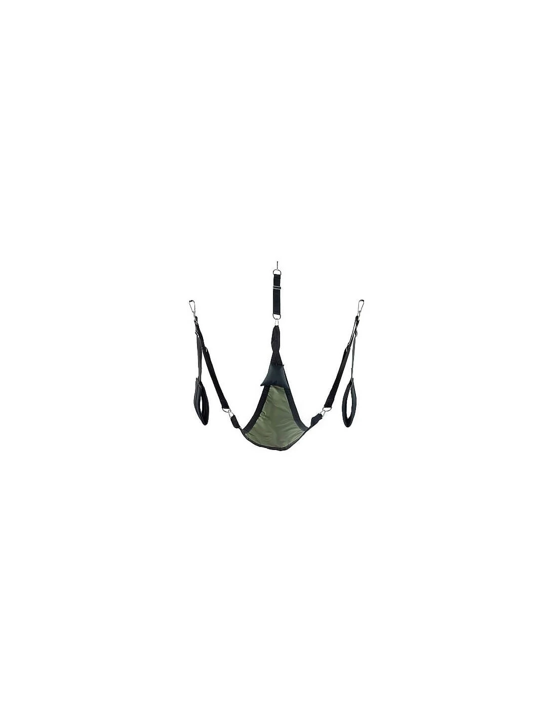 de 4 hangers met de metalen karabijnhaken / de gewatteerde voetsteunen (11cm breed) / de zwarte driehoek kussen (24 x 20cm) Materiaal: