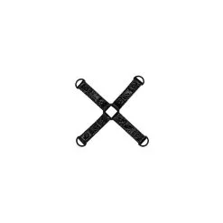 De hogtie bestaat uit 2 enkelboeien, 2 handboeien, en een “kruis” met vier O-ringen.