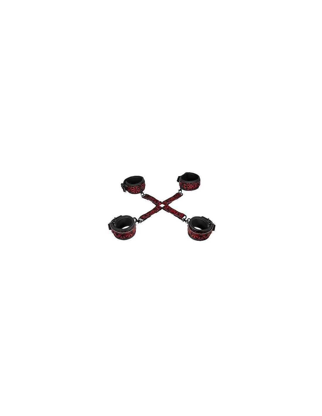 De hogtie bestaat uit 2 enkelboeien, 2 handboeien, en een “kruis” met vier O-ringen.
