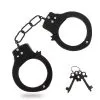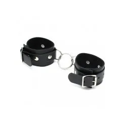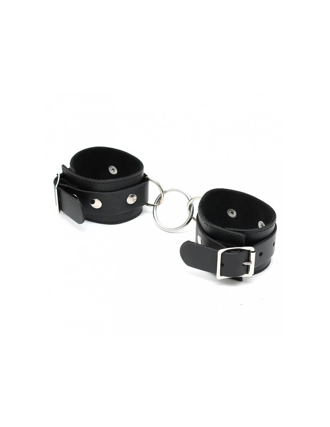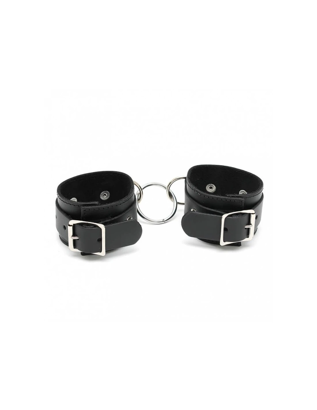 Deze leren handboeien worden samen gehouden door een metalen ring.