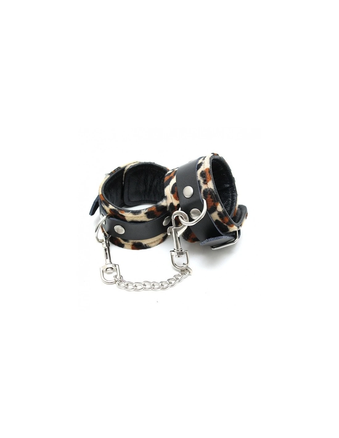 Echt lederen handboeien in zwart met leopard look aan de buitenkant.