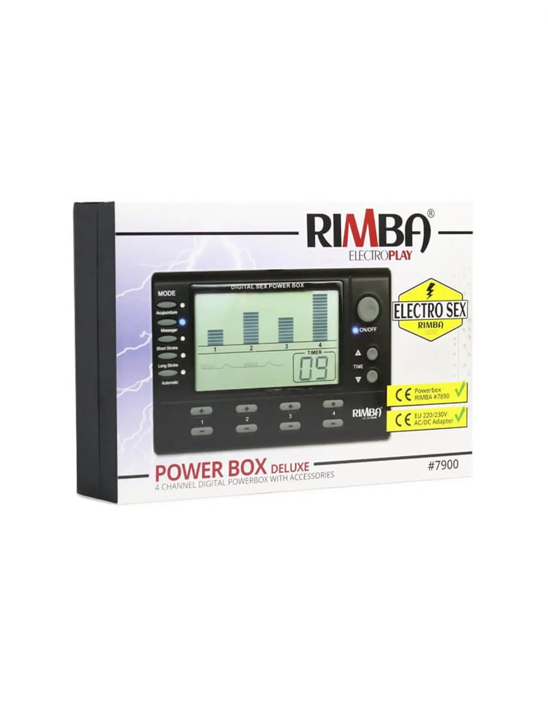 De 4-kanaals Rimba powerbox (#7900) heeft een LCD-scherm en kan tegelijkertijd 4 verschillende bipolaire accessoires van stroom voorzien. Alle 4 kanalen kunnen afzonderlijk worden bediend door op de knoppen te drukken. Het scherm toont de individuele zenderintensiteit en het gekozen programma in een diagram. Deze powerbox kan zowel gevoed worden door een gewone voeding (220/230V; AC/DC) als door 3 AAA-batterijen.
