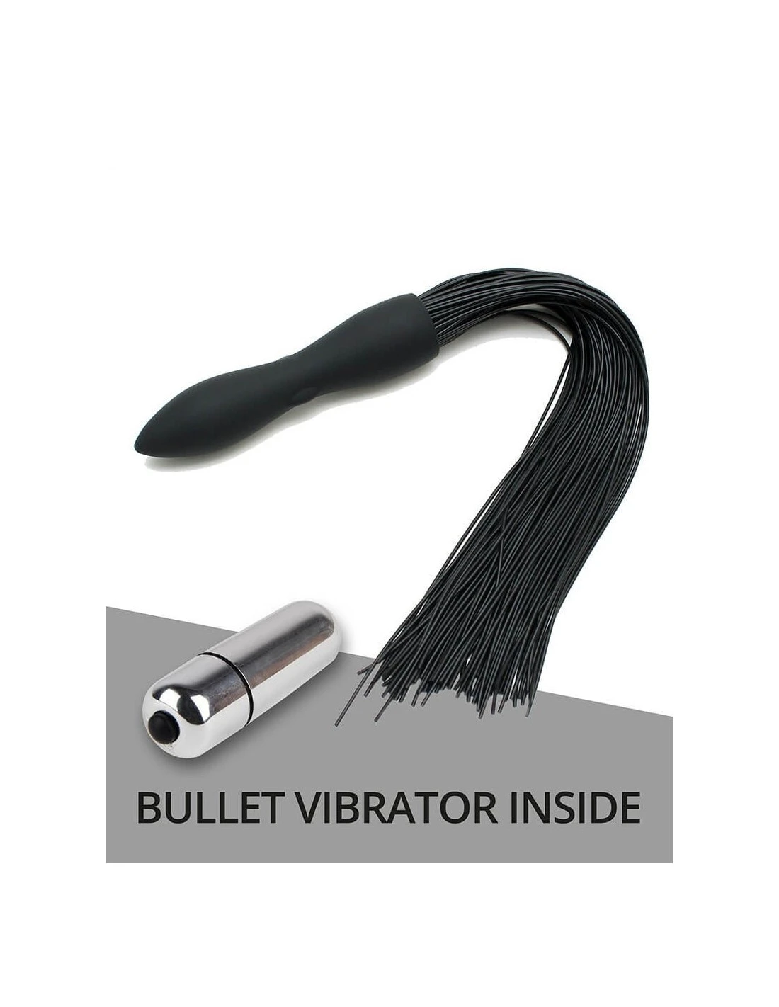 De zweep heeft aan het uiteinde een dildo met een bullet vibrator.