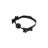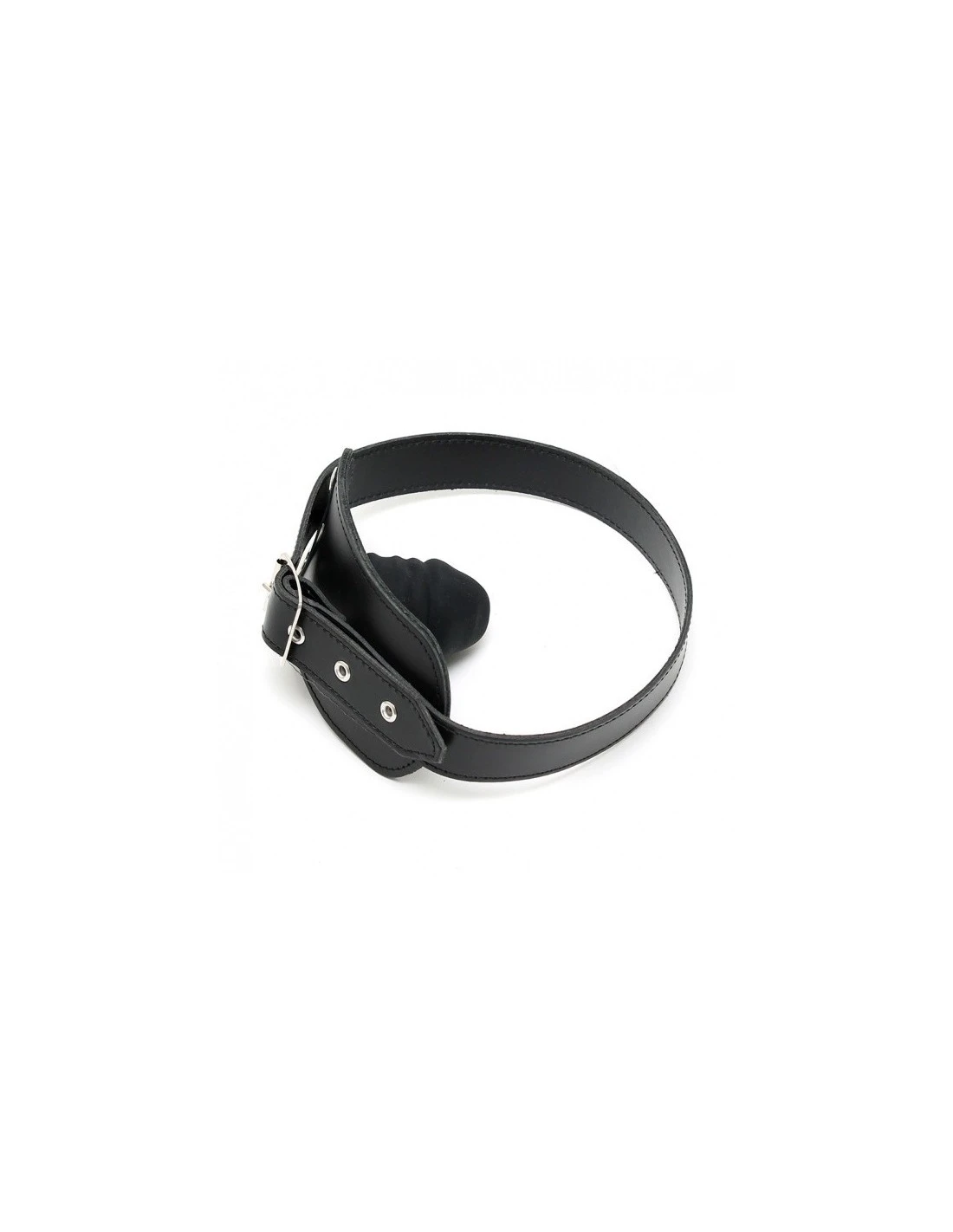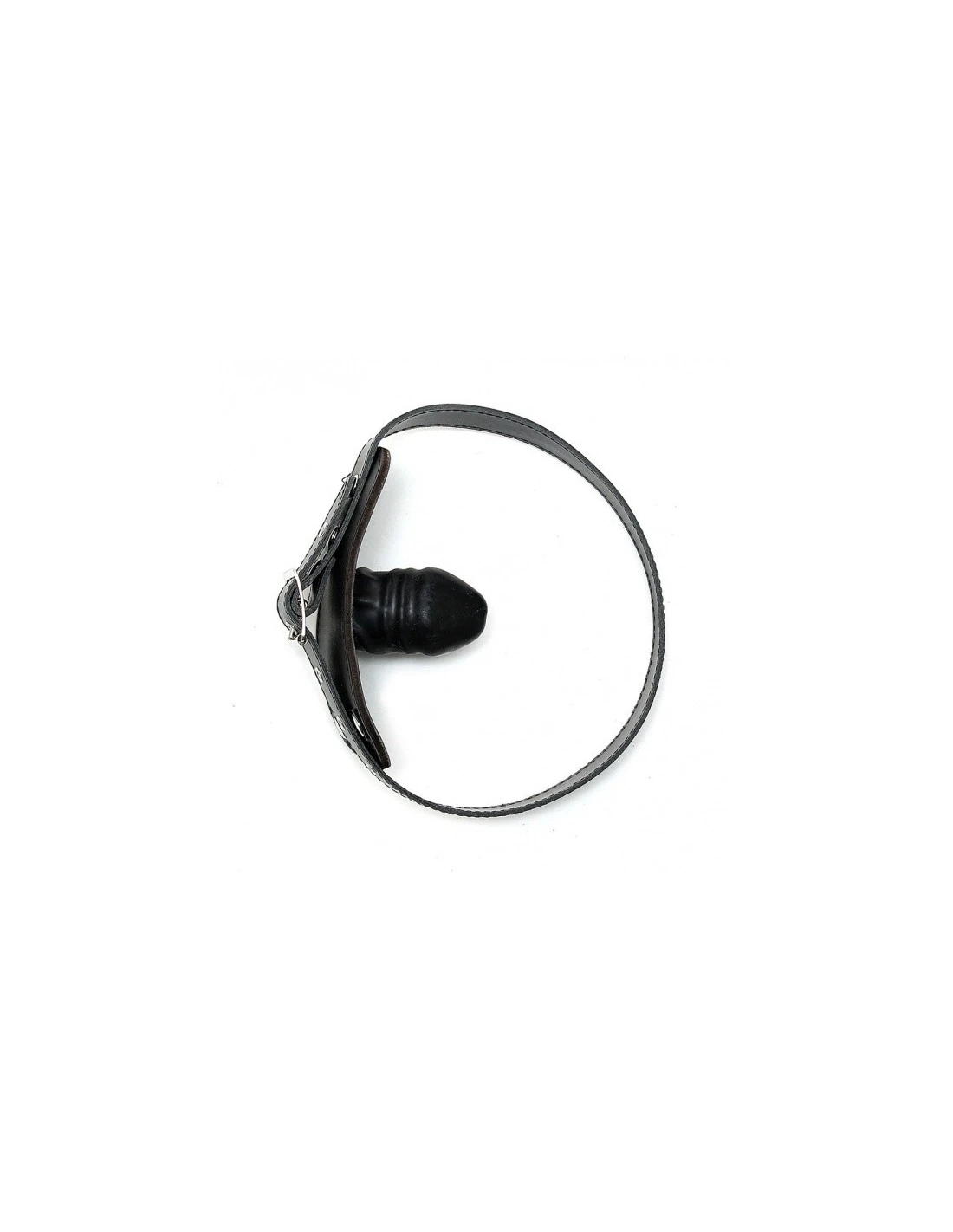 Deze leren mondknevel heeft een latex dildo die de mond in gaat met een afmeting van 4 x 6 cm.
