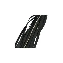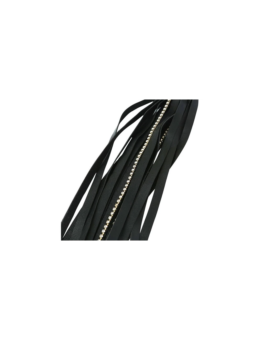 Een handvat gebonden in zwart veganistisch leer zorgt voor een comfortabele grip en leidt het oog naar bungelende staarten die verleiden als ze glanzen.