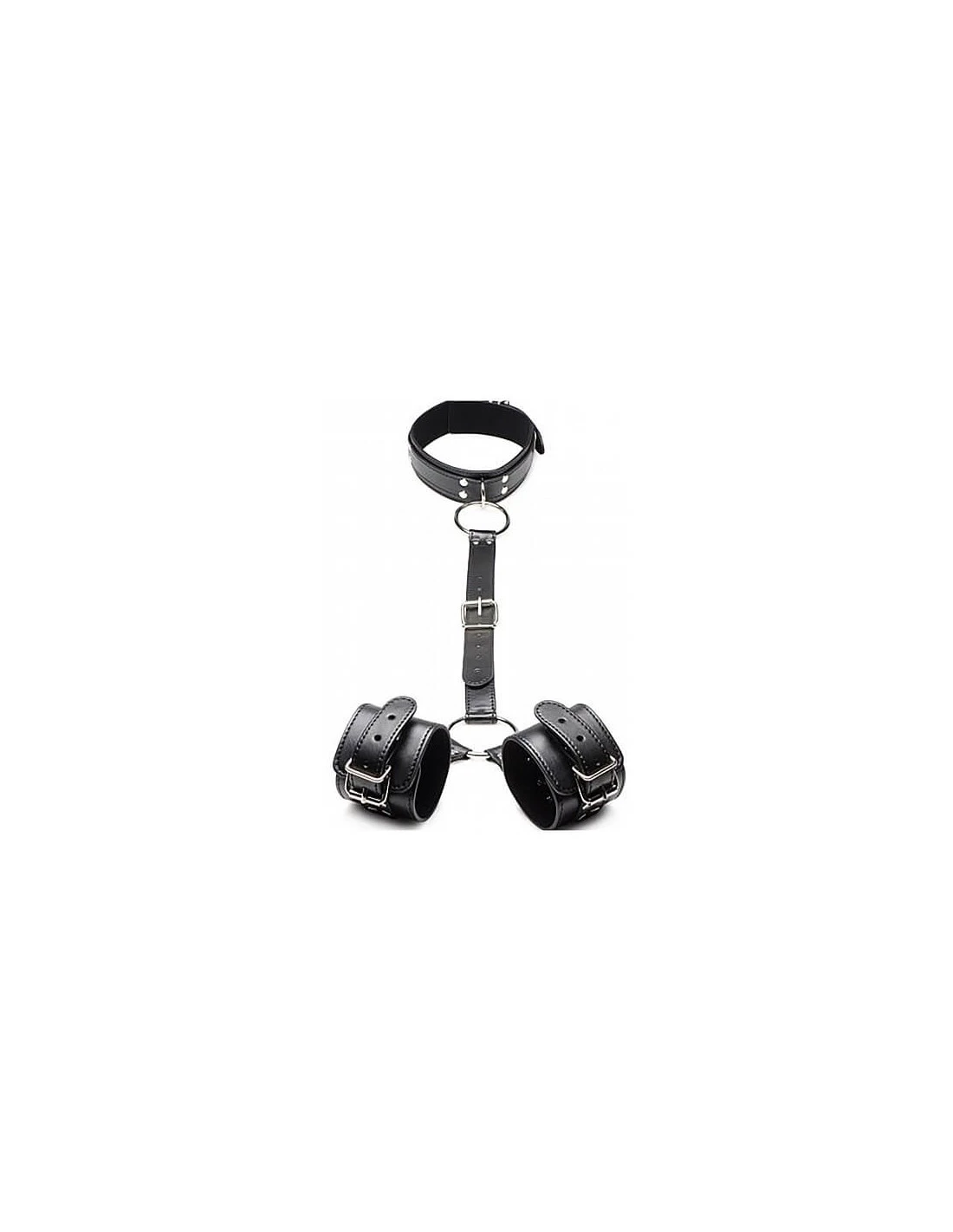 Hun polsen worden geboeid en vastgehouden, de middelste riem wordt aan hun hals met kraag vastgemaakt.