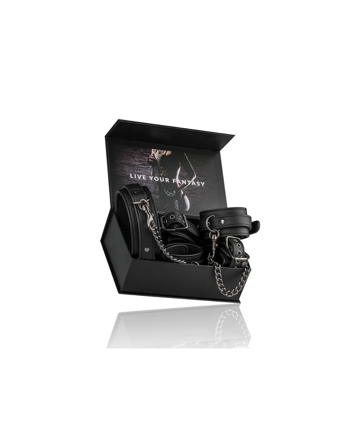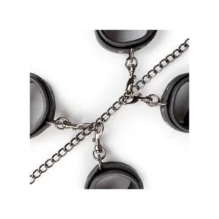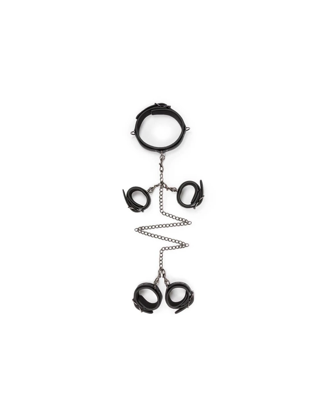 Hij bestaat uit een halsband, handboeien en enkelboeien die gemakkelijk van elkaar gescheiden kunnen worden door middel van de clipsluitingen.