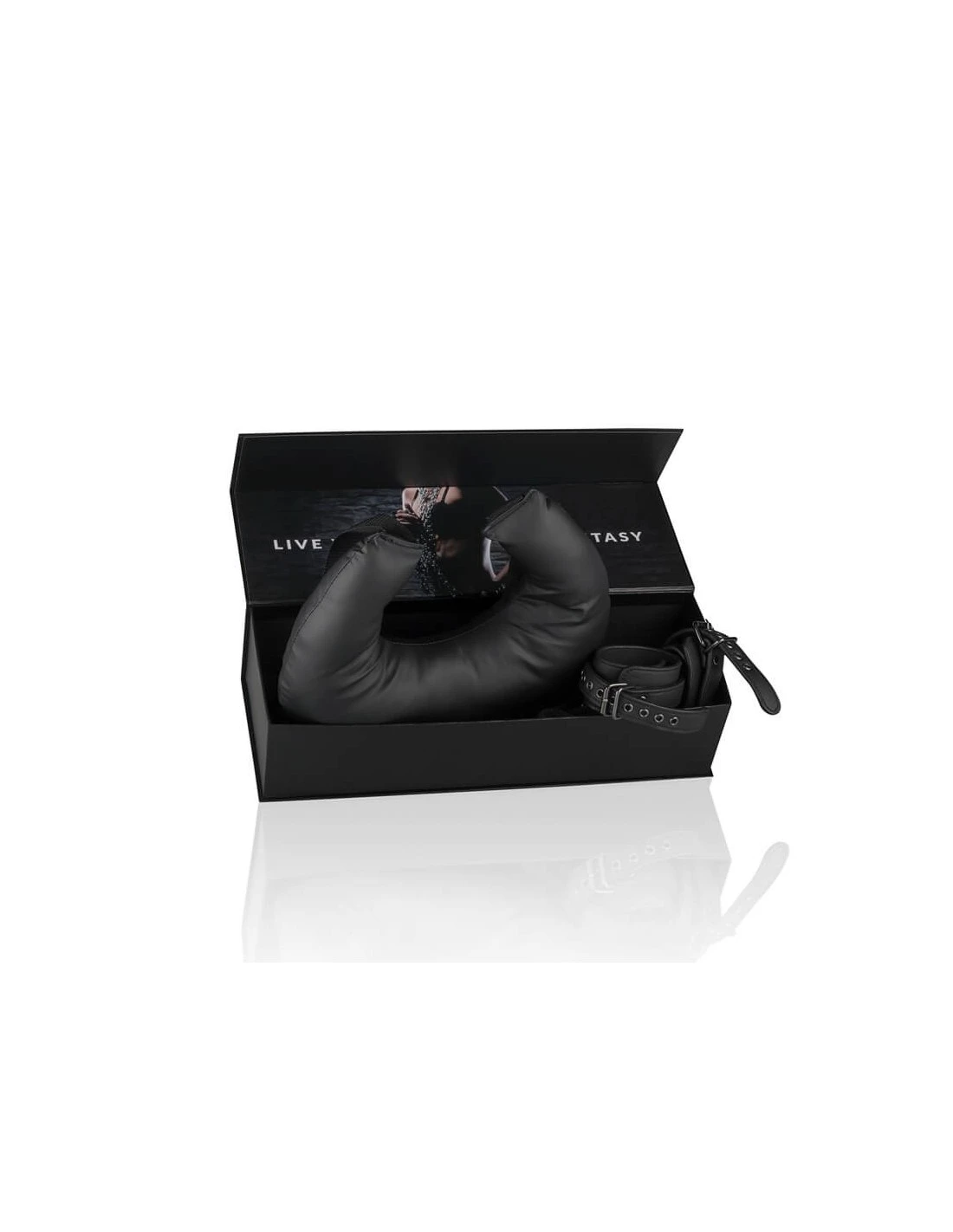 Om hem te gebruiken doe je de boeien om je enkels en het kussen om je nek.